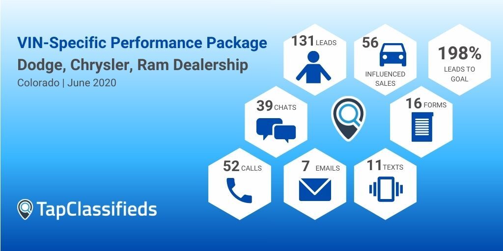 According to Driving Sales, VIN-Specific leads generate the highest closing percentages for dealerships. The TapClassifieds Network increases sales opportunities for your sales team to convert with VIN-Specific calls, chats, emails, form fills and text messages with full reporting attribution by platform and campaign.
